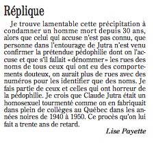 Madame Lise Payette a publié un texte en soutient à son ami Claude Jutras hier dans le devoir et a ajouté une réplique ce matin, que voici: